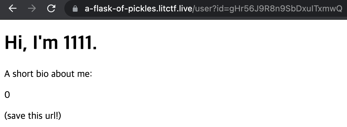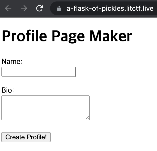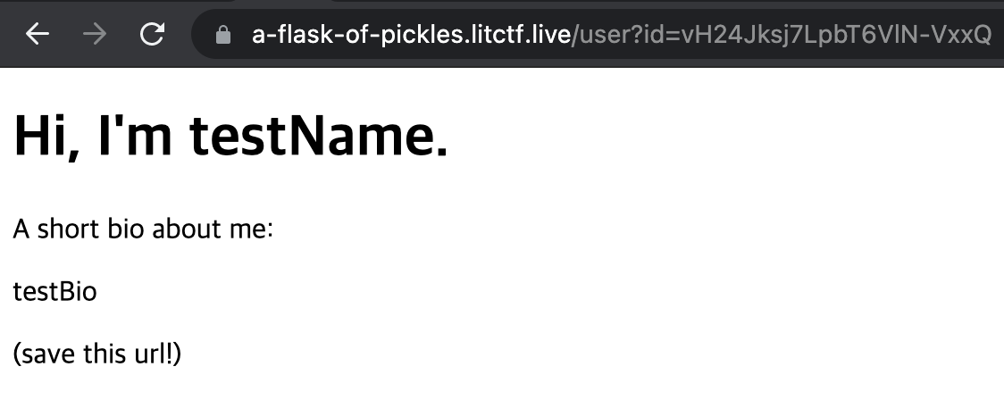 <!DOCTYPE HTML> <html> <head> <title>Profile Page Maker</title> <style> </style> <script> function submit(){ let p1 = "\x80\x04\x95" let p15 = "\x00\x00\x00\x00\x00\x00\x00}\x94(\x8c\x04name\x94\x8c" let p2 = "\x94\x8c\x03bio\x94\x8c" let p3 = "\x94u." let name = document.getElementById("name").value; let bio = document.getElementById("bio").value; let s = p1 + String.fromCharCode(p1.length + 1 + p15.length + 1 + name.length + p2.length + 1 + bio.length + p3.length - 11) + p15 + String.fromCharCode(name.length) + name + p2 + String.fromCharCode(bio.length) + bio + p3; let enc = window.btoa(s); console.log(enc); var xhr = new XMLHttpRequest(); xhr.open("POST", "new", true); xhr.setRequestHeader("Content-type", "application/x-www-form-urlencoded"); xhr.onload = function (){ window.location.href=this.responseText; }; xhr.send(enc); } </script> </head> <body> <h1>Profile Page Maker</h1> <label for="name">Name:</label></br> <input type="text" id="name" name="name"></br></br> <label for="bio">Bio:</label></br> <textarea id="bio" name="bio" rows="3" cols="20"></textarea></br></br> <button onclick="submit();">Create Profile!</button> </body> </html>데이터를 받아서 처리 하는 로직 또한 바이트 데이터로 일종의 필터링이 되어 있다.