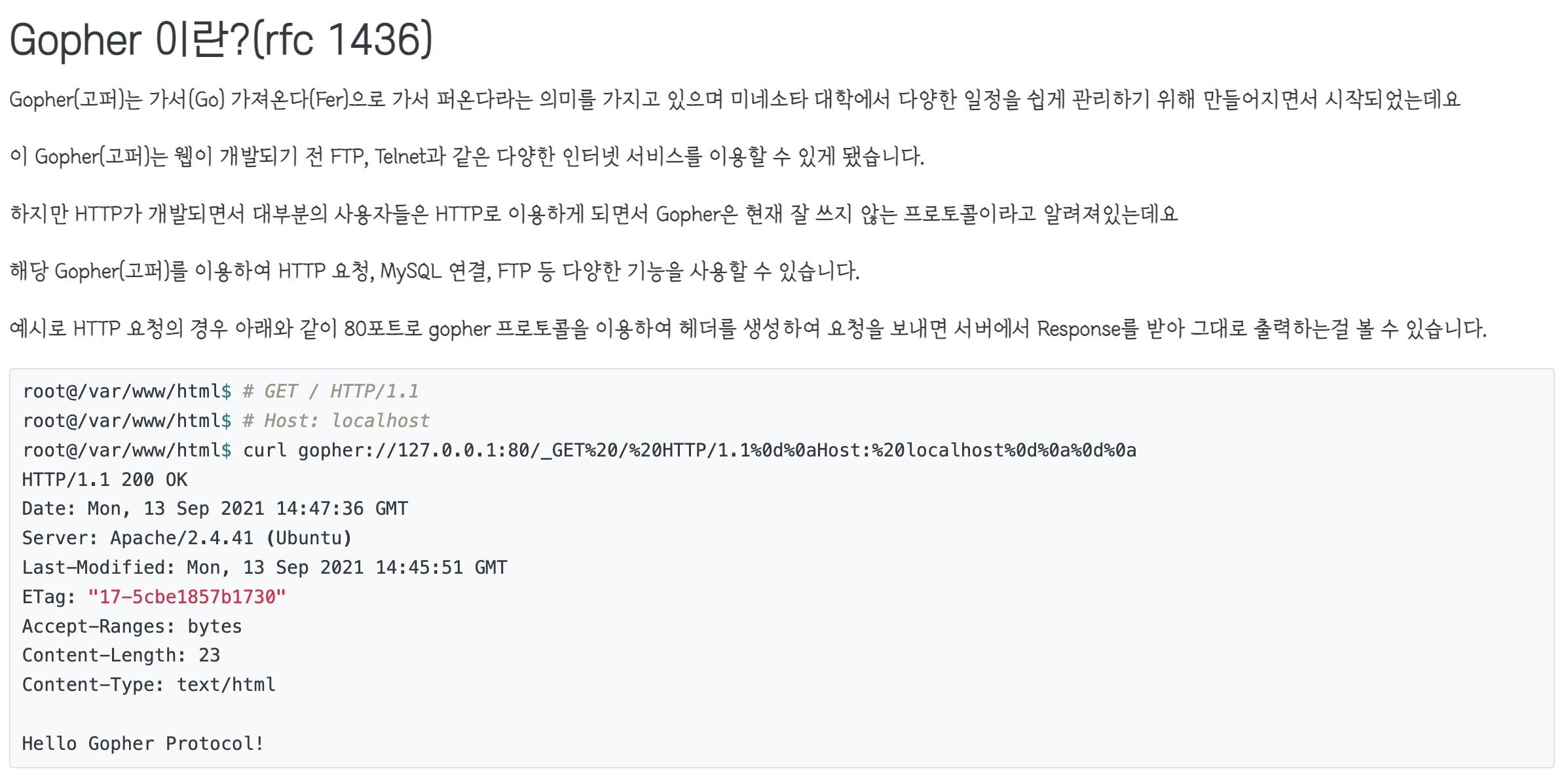 SSRF 취약점이 발생할 때 Gopher Protocol을 이용하여 MySQL에 쿼리를 주입하여 있는 데이터베이스 정보를 탈취할 수 있습니다.