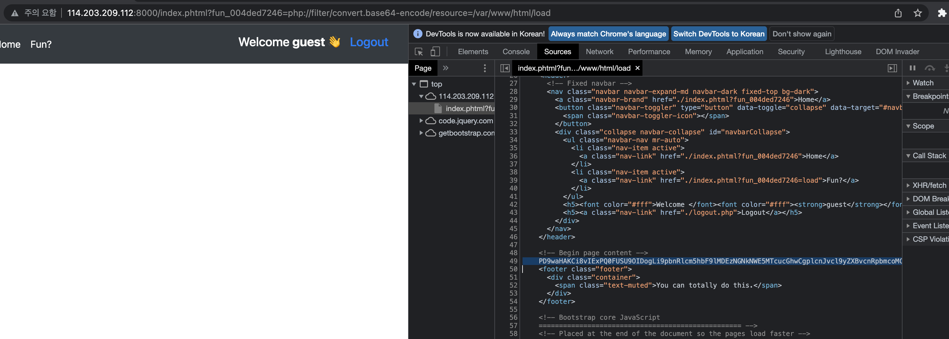 해당 서버는 php로 구성되어 있으므로 php wrapper를 통해 index.phtml load.phtml 의소스코드를 획득 할 수 있었다.
