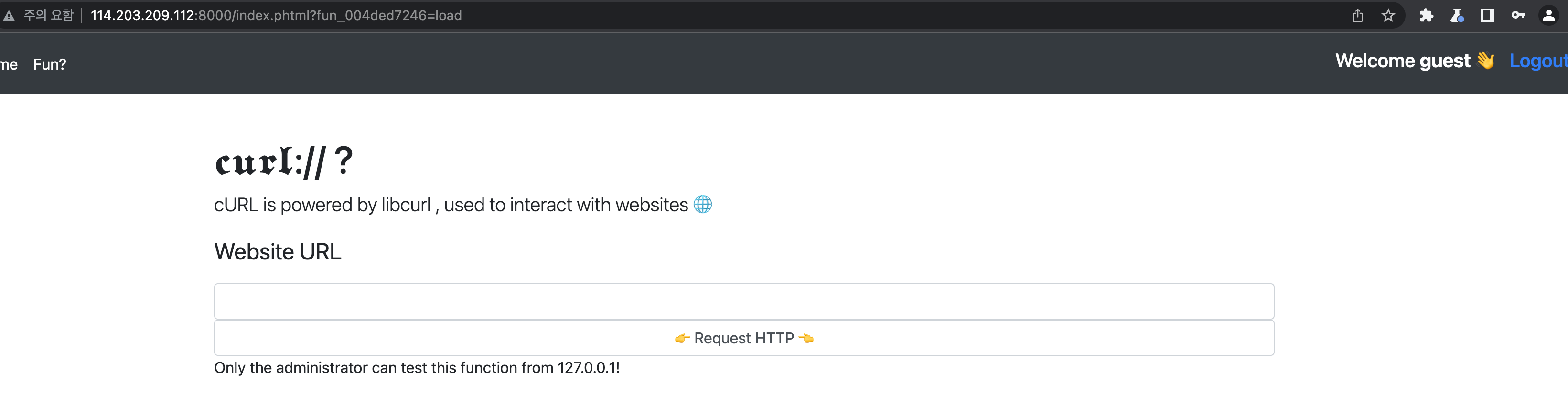 guest / guest 로 로그인하면 curl 기능을 사용 할 수 있는 듯 한 페이지로 안내된다. 하지만 관리자 권한이 없어서 해당 기능을 테스트 할 수 없다.