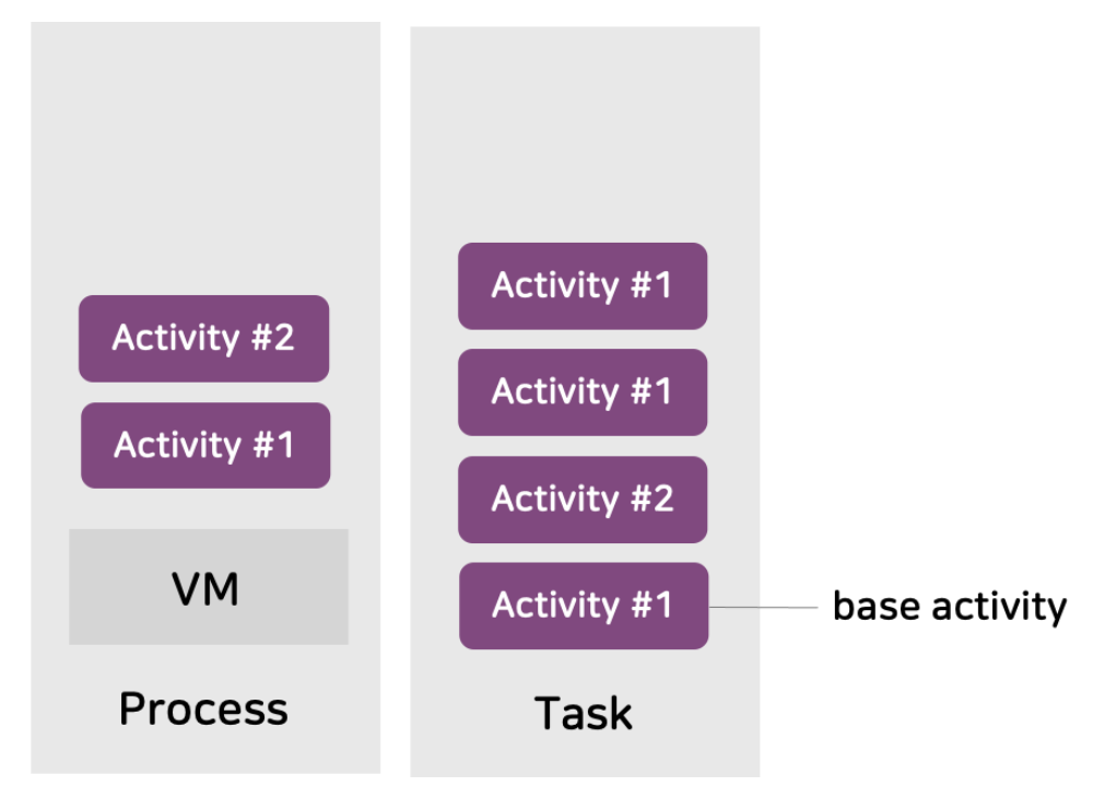 우선 안드로이드 환경에서 Task에 대해 간단히 소개하자면, Task란 어플리케이션에서 실행 되는 액티비티를 기록하는 스택이다. 사용자가 사용하는 액티비티들이 스택에 쌓이고, 뒤로가기 등을 통해 최근의 Task를 벗어나면 해당 액티비티가 pop되어 그 아래에 쌓여있던 액티비티가 보여지는 개념이다.