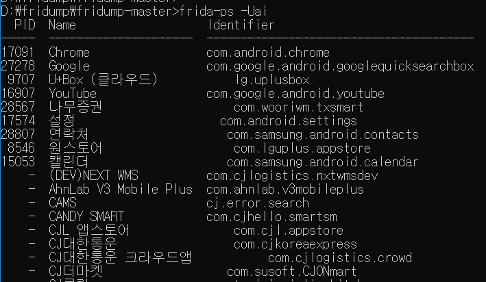 fridump를 통해 아래와 같이 메모리 덤프를 시도한다. 참고로 fridump를 셋팅할수있는 채널이 여러개 있는것으로 알고있는데, 경우에 따라 USB 옵션이 -u 또는 -U 중에 다른 경우가 있었고, -r 의 인자가 PID가 유효한 경우, NAME이 유효한 경우 등 약간 다른 케이스가 있었다.