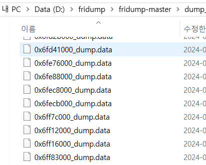 python fridump.py -U -r [PID or NAME]정상적으로 실행 되면, 아래와 같이 .data 파일들이 추출된다. 참고로 -s 옵션을 추가하면 추출되는 String이 모아져있는 파일이 하나 생성되기도 한다. 개인적으로는 Notepad++의 기능 중 경로내 파일들을 대상으로 서치하는 기능을 사용하곤 했다.