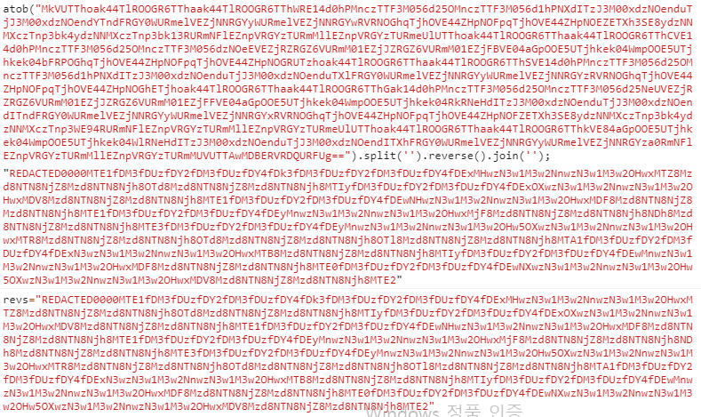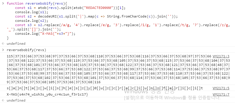 function reversebobify(revs){ const s1 = atob(revs).split(atob("REDACTED0000"))[1]; console.log(s1); const s2 = decodeURI(s1.split('|').map(c => String.fromCharCode(c)).join('')); console.log(s2); const s3 = s2.replace(/a/g, '4').replace(/e/g, '3').replace(/i/g, '1').replace(/t/g, '7').replace(/z/g, '_').split('[]').join(''); console.log("X-MAS{"+s3+"}"); }실제로 수행하면 정상적으로 플래그를 획득 할 수 있다.